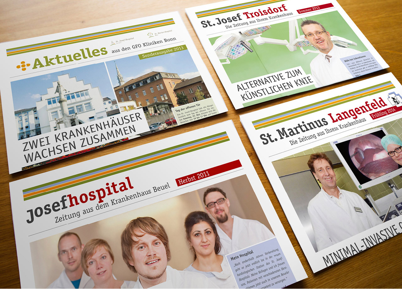 Ihre Leitidee „Ja zur Menschenwürde“ realisieren die modernen GFO Kliniken durch hochwertige Kompetenzzentren, neueste Ausstattungen und besondere Therapieformen. Um dieses hohe Niveau an Qualitätsstandards zu verbreiten, ist eine gut dosierte Presse- und Öffentlichkeitsarbeit das beste Rezept. Während Hauszeitschriften sensible Einblicke in die Tiefe geben, erzeugen gezielte Werbekampagnen großflächige Aufmerksamkeit. Im wissenschaftlichen Diskurs benutzen die Klinik-Professoren unsere anschaulich gestalteten Infomaterialien mit aufwendigen Grafiken.